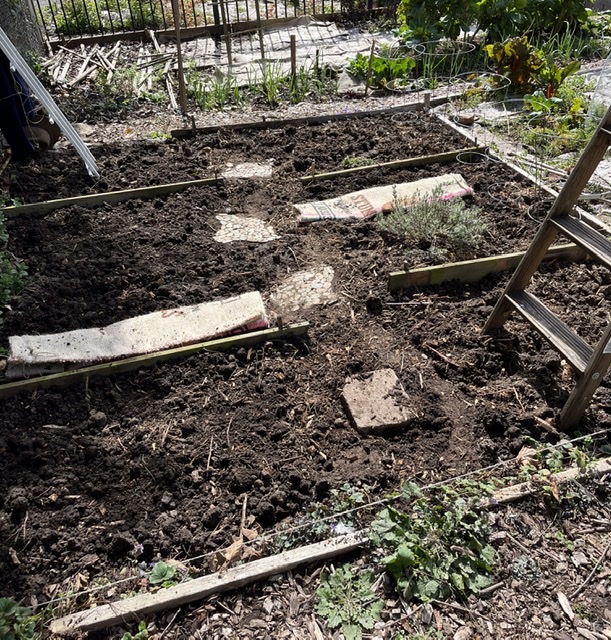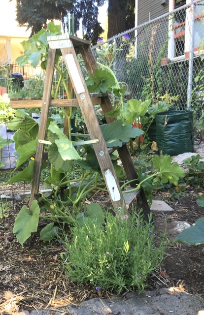 The zucchinis are planted under the ladder, so they will have something strong to climb on and keep the zukes off the ground. I will add pumpkins later in the spring.