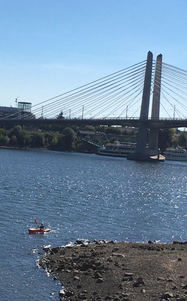 And what I found were amazing views! Downtown was laid out in sparkling detail. I stopped every twenty feet or so and took another picture. Here is the Fremont Bridge (on the left) with Mt. Saint Helens, 70 miles away, beyond.