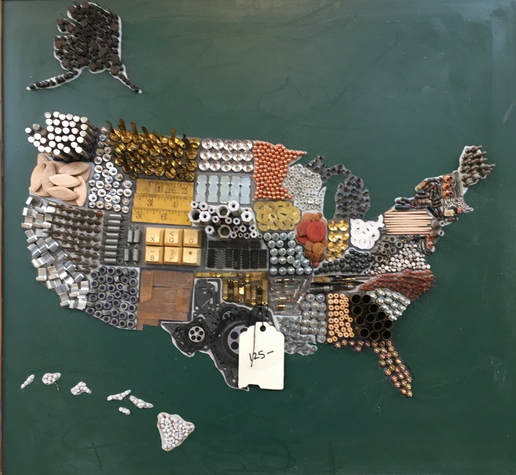 This art show featured work by both professional artists and students, and I enjoyed both. These hardware-store mosaics by Gretchen Wright were so much fun to look at! She used things that are normally stored in chaotic little drawers, like tacks, game pieces, and electronics bits, and made them fun to look at.