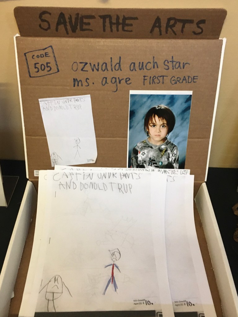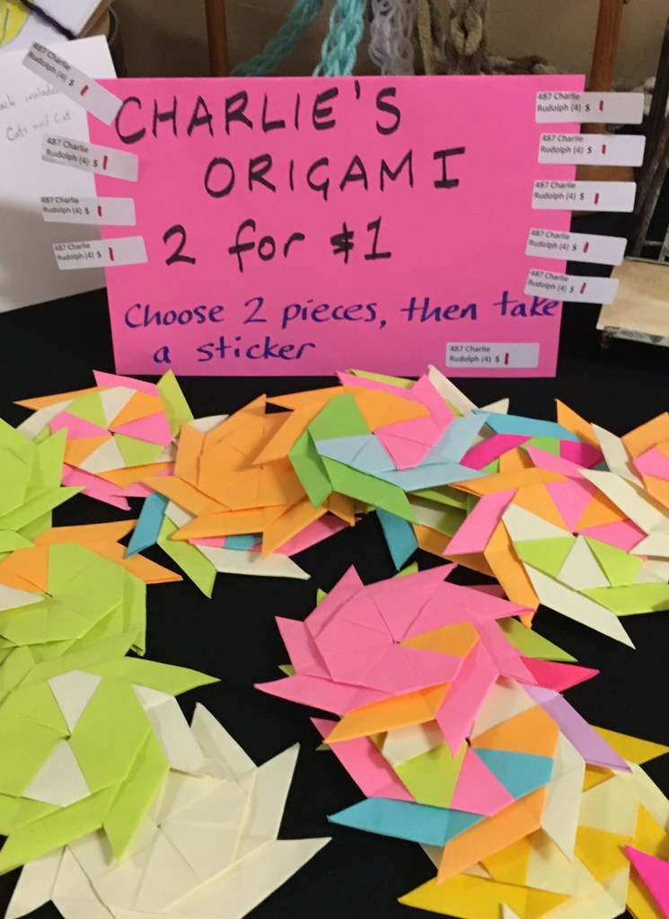 The student work for sale was fun to see, too. There were comic books by Ozwald Star, called “Captain Underpants and Donald Trump”, were the most controversially-minded. There were jewelry, coasters, and friendship bracelets, but what caught my eye was Charlie’s Origami.