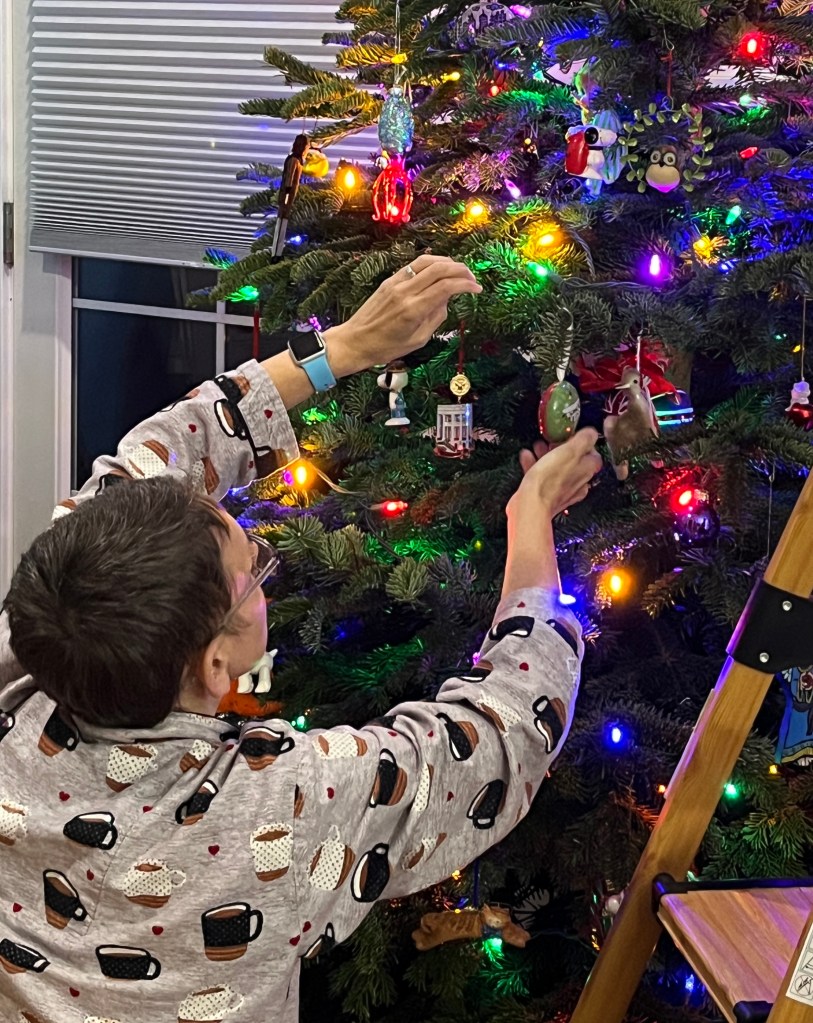 And now it’s time to put them all away. I know, we usually leave things up until the New Year, but our tree is crispy-dry and may be aggravating Bridgett’s allergies. Mouse the cat is getting even nuttier than usual about the ornaments.