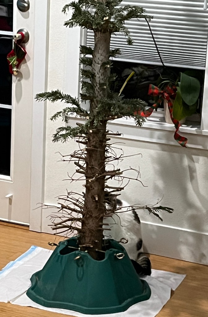 To get it out of the house without tracking needles over three floors, I got out the pruning shears and pared it down to the nubbins. The branches were taken down in bins and the stump will get lowered off the balcony, sawn in half, and composted. Mouse was not pleased.