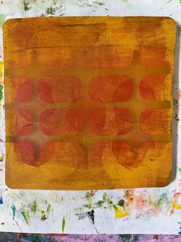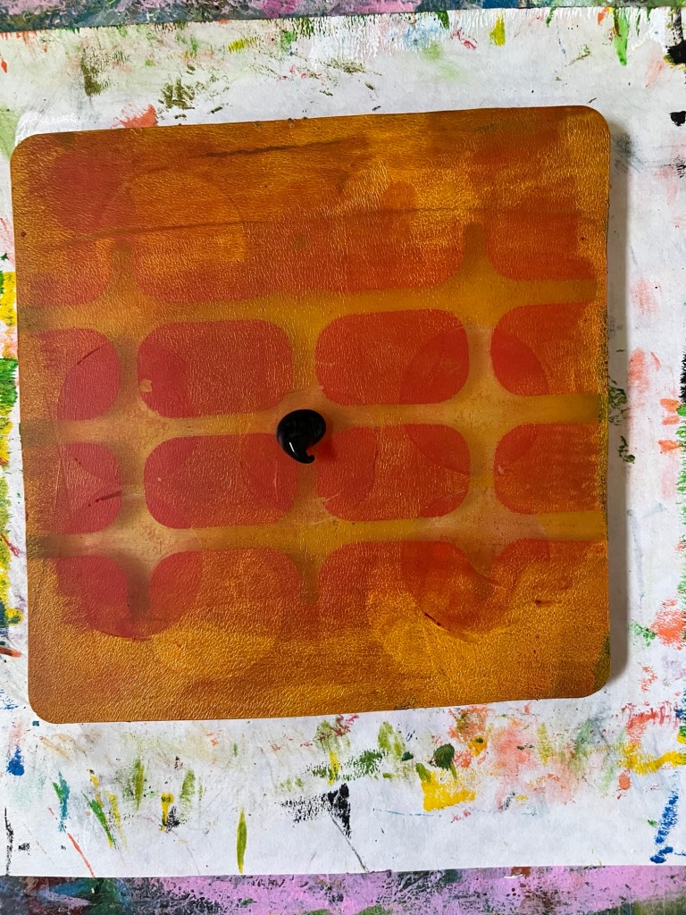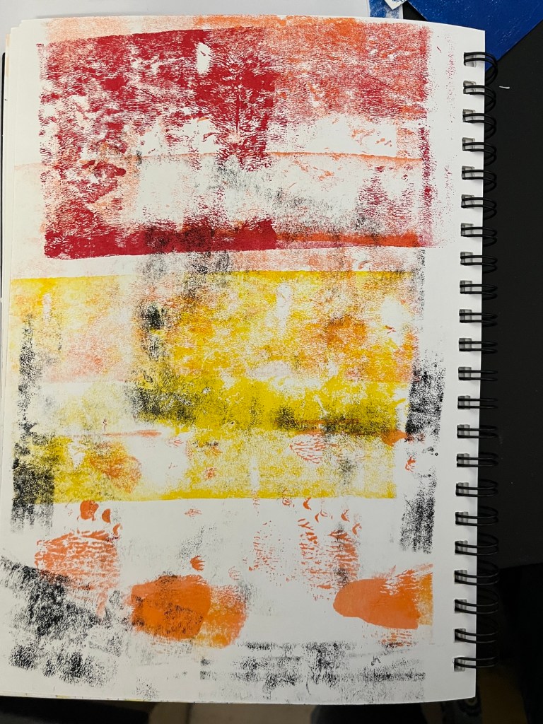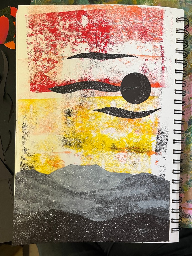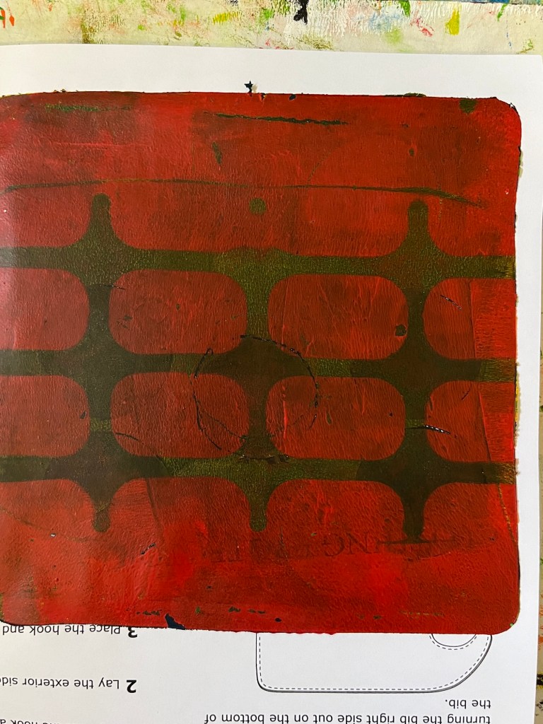 So, skyscrapers cut from the recent voter’s pamphlet got added. But now the sky looked too empty! I tried a cool tissue paper Gelli print, but it was just too much. And where should that bicycle go?