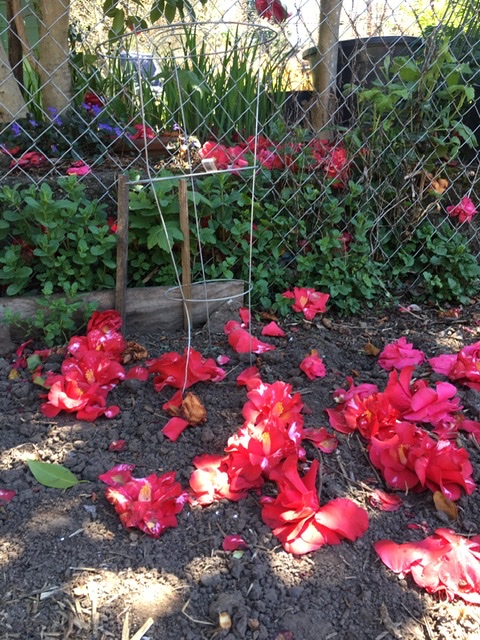 Of course, the camellia bush next door continues to drop its lovely blooms on my plot, and the water for the garden hasn’t been turned on yet (it’s not ours to control… it belongs to the hospital whose land we are using). I will need to carry the big watering can up to the allotment twice a day until it is, to make sure my seedlings get what they need. So there are, you know, glitches.