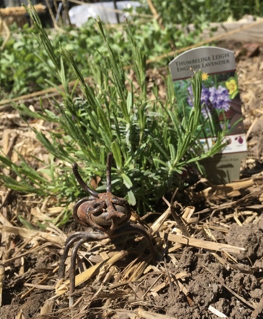 The pumpkin seedling is standing tall, up to about four inches so far. It has a little mound all to itself by the miniature lavender plant.