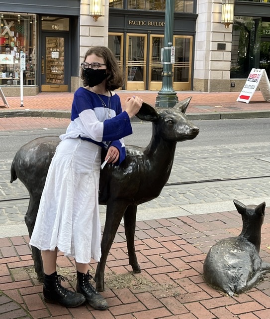 I started looking. I found Kes posing with one of the deer statues downtown in 2017.