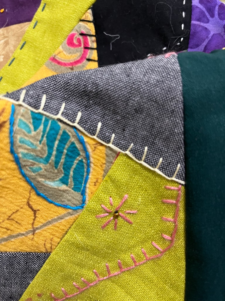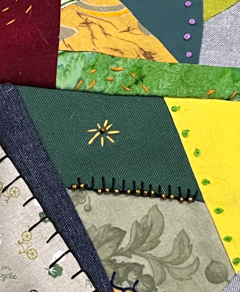 I know Crazy Quilts are an OLD thing, but mine is a NEW thing, at least to me. Combining piecing, embroidery, beading and quilting in one totally original creation big enough for two people to snuggle under was a seven month expeiment. It worked out pretty well.