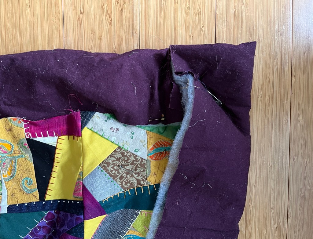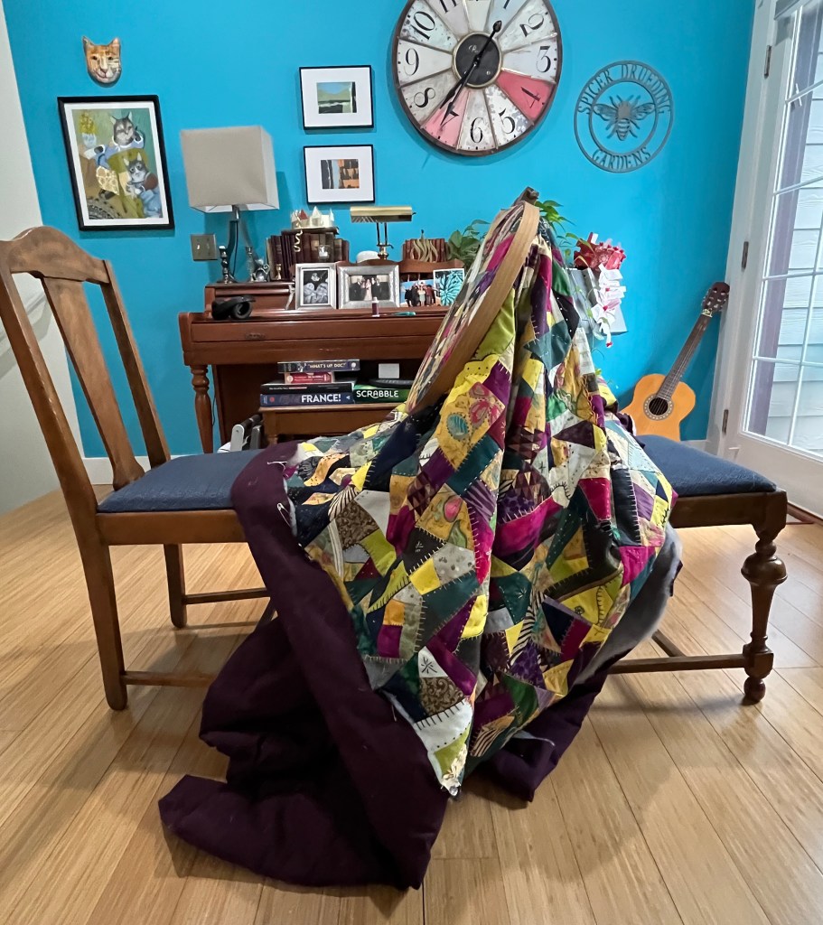First, the quilt is heavy, and moving it around is a challenge. It is big, at five by seven feet, and the edges are bulky and floppy. Our living room is too small for a free-standing quilting frame, so I needed to find another way.