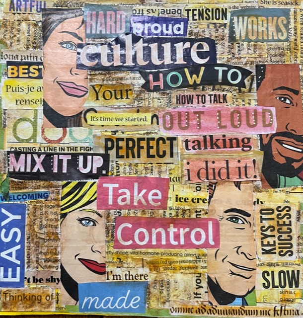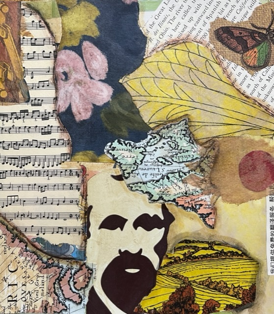 First, I pulled tons of colors and images from my collage boxes and Jennifer Coile’s gift of museum calendars. I trimmed them and laid them down, seeing who played nicely and who didn’t.