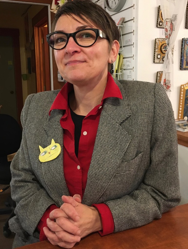Being at the gallery is also fun because I get to visit with the other artists. Dawn Panttaja, who plays in the Karaoke From Hell music group we saw on Halloween, makes delightful sculptures of blue-green mythical characters.