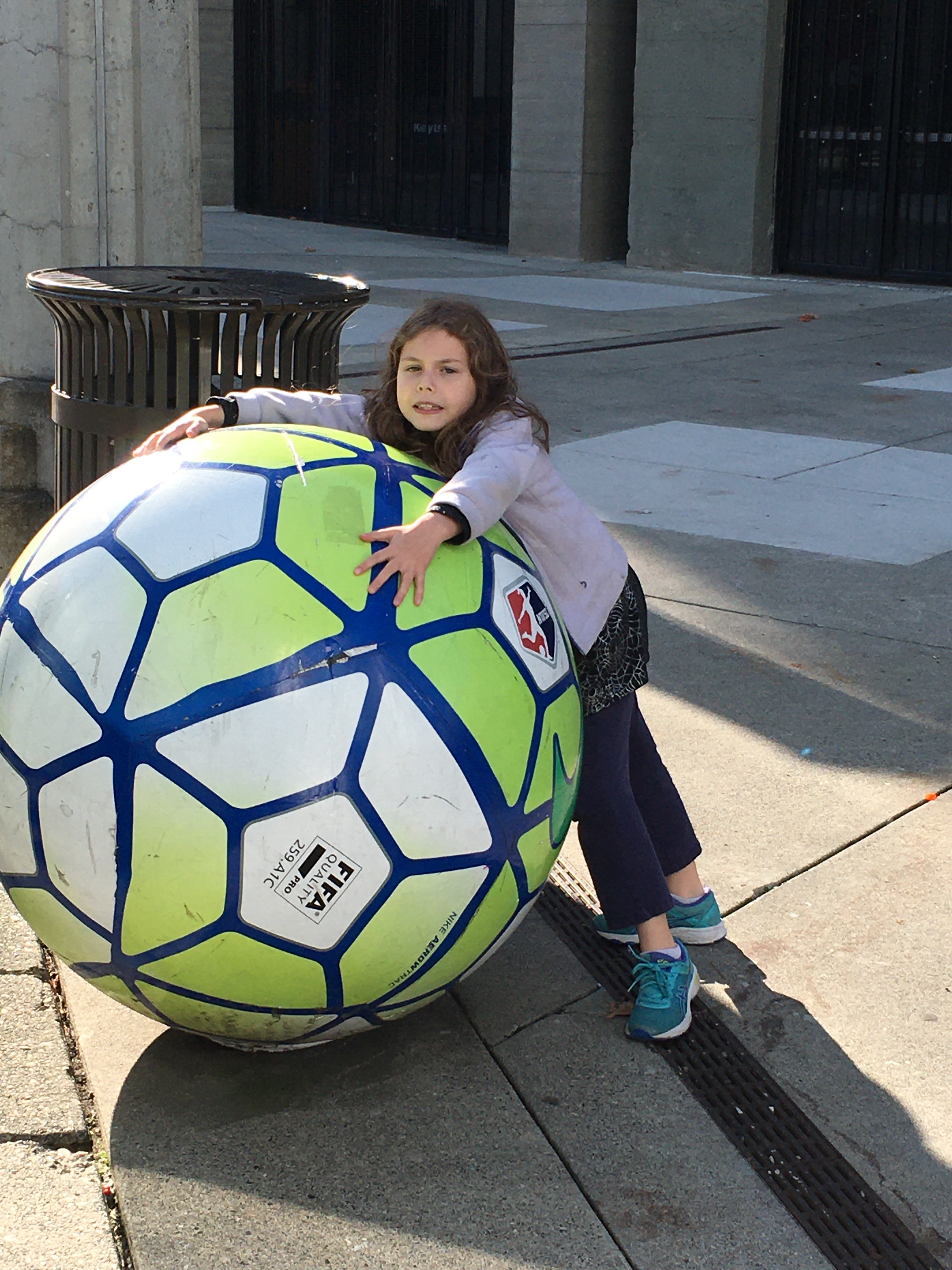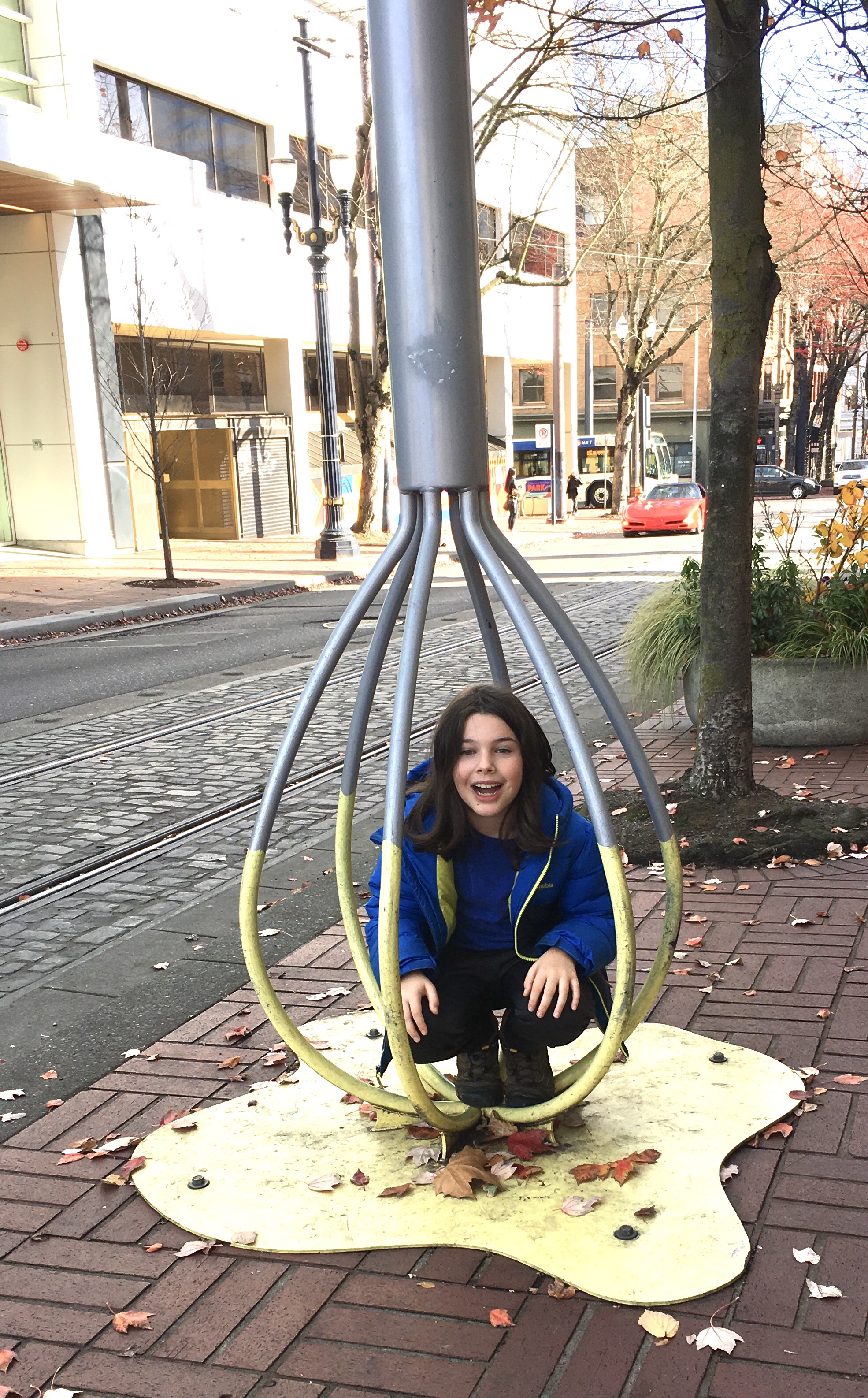 After we caught the number 2 bus and got downtown, we had fifteen blocks to walk and about half an hour to catch the 63 bus that would take us up the hill. We strolled through the city streets, playing with public art and making up stories about the statues.