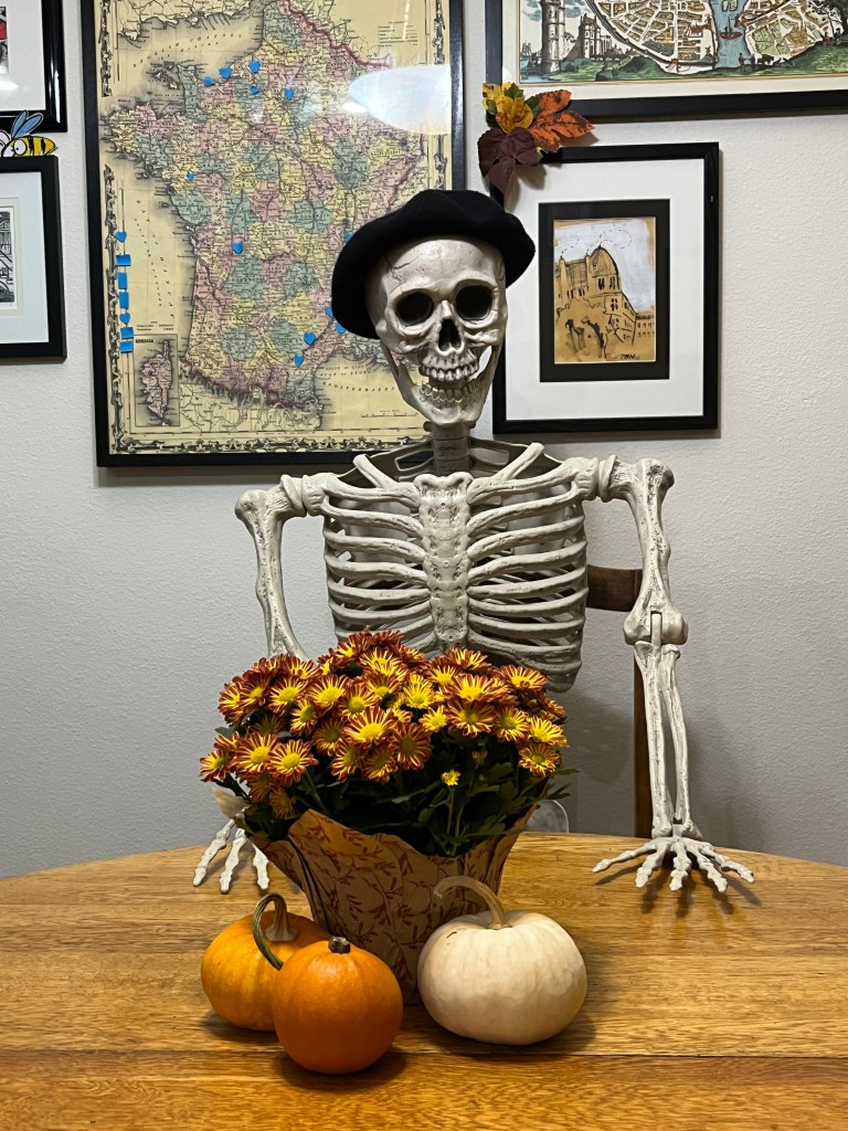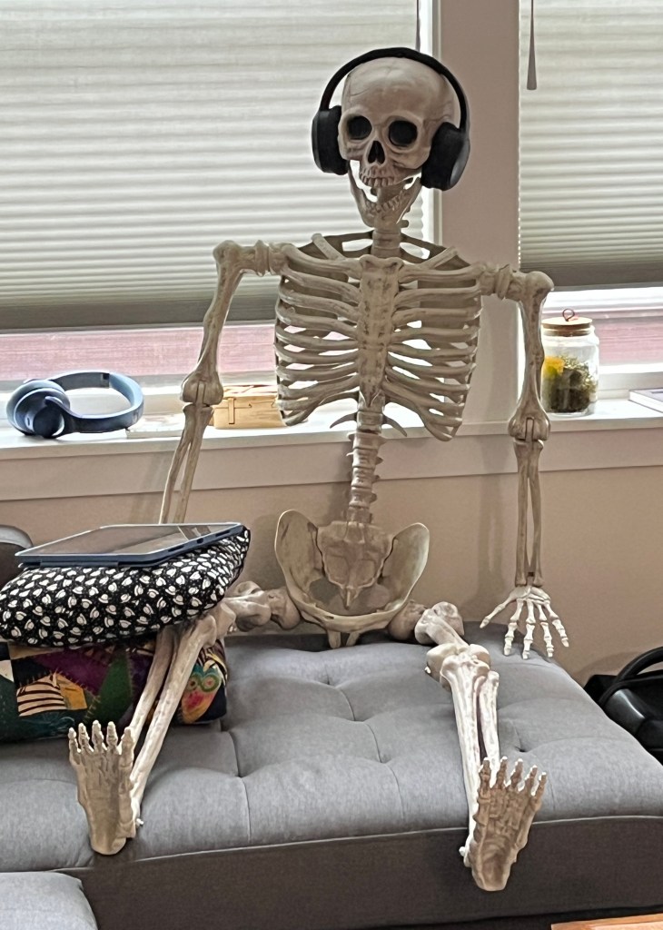 That big skeleton we got has been inspiring all sorts of shenanigans. He’s been rocking out with my new headphones, or maybe he is studying French on Duolingo, like the rest of us.