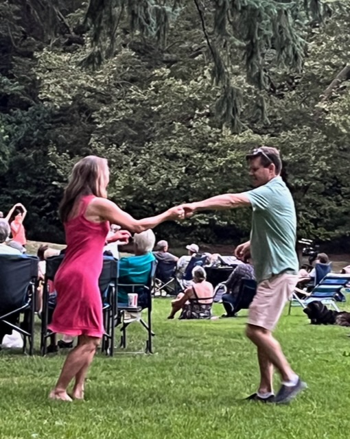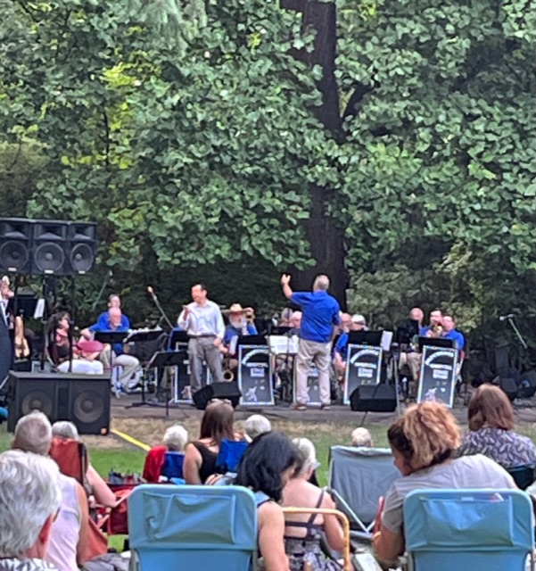 The Providence Stage Band is a very talented group of doctors from our local hospital, and they were performing a concert. We love their Big Band and Jazz era music, and the vocals were classic. “Ain’t that a Kick in the Head?” and “Queen Bee”, “Too Darn Hot” and other songs from the 40s and 50s bounced among the Douglas Firs and picnickers.