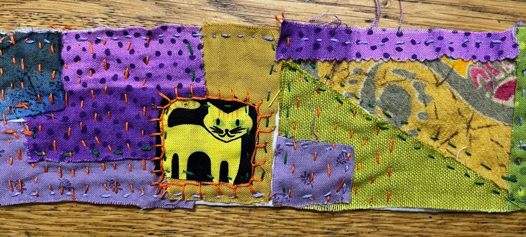 So I am practicing! I am making a 30 inch long, 3 inch wide strip, quilted, appliquéd and embroidered. I am not sure what I will use it for, but something will come to me. Wall decoration? Head band? Ridiculously long book mark?