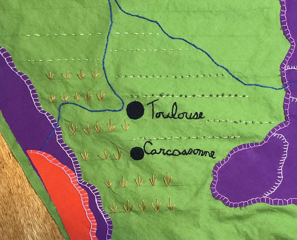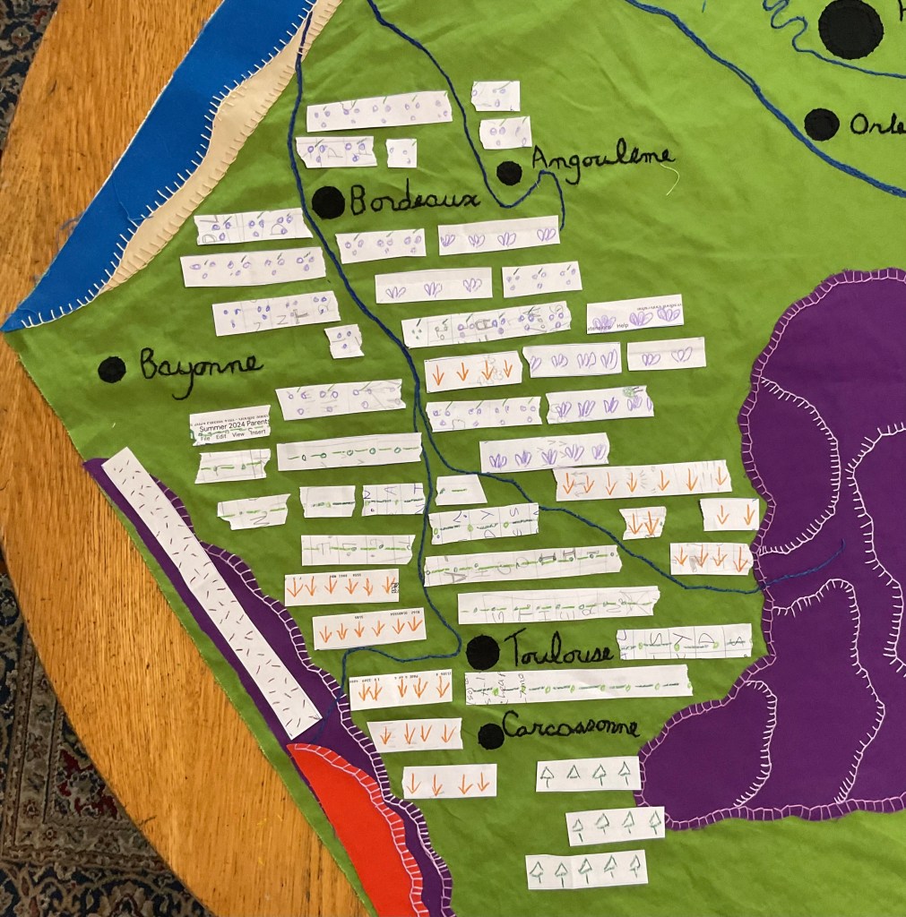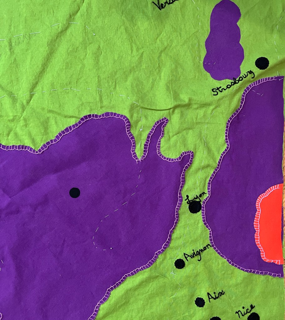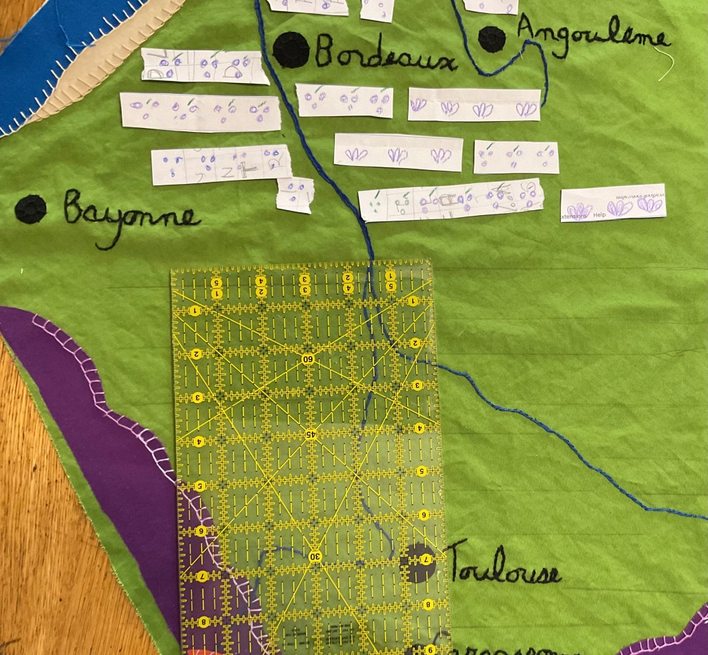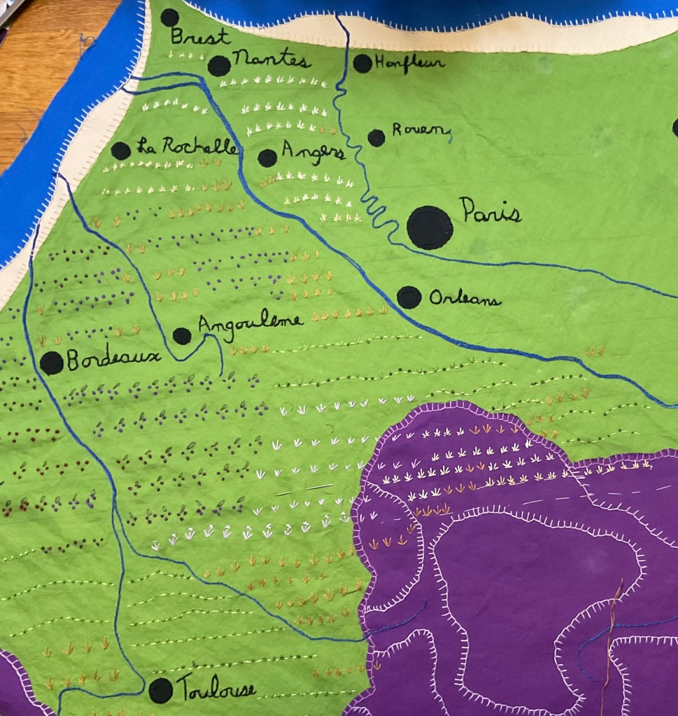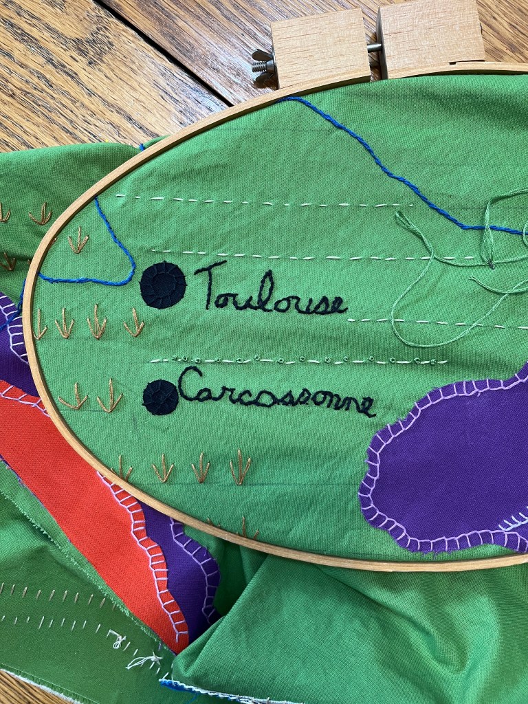 As I stitch more on my map of France, adding dozens of icons for row crops, vineyards and wheat fields, I feel like I’m looking backward and forward at the same time.