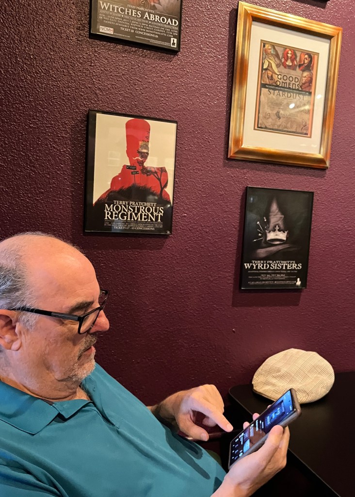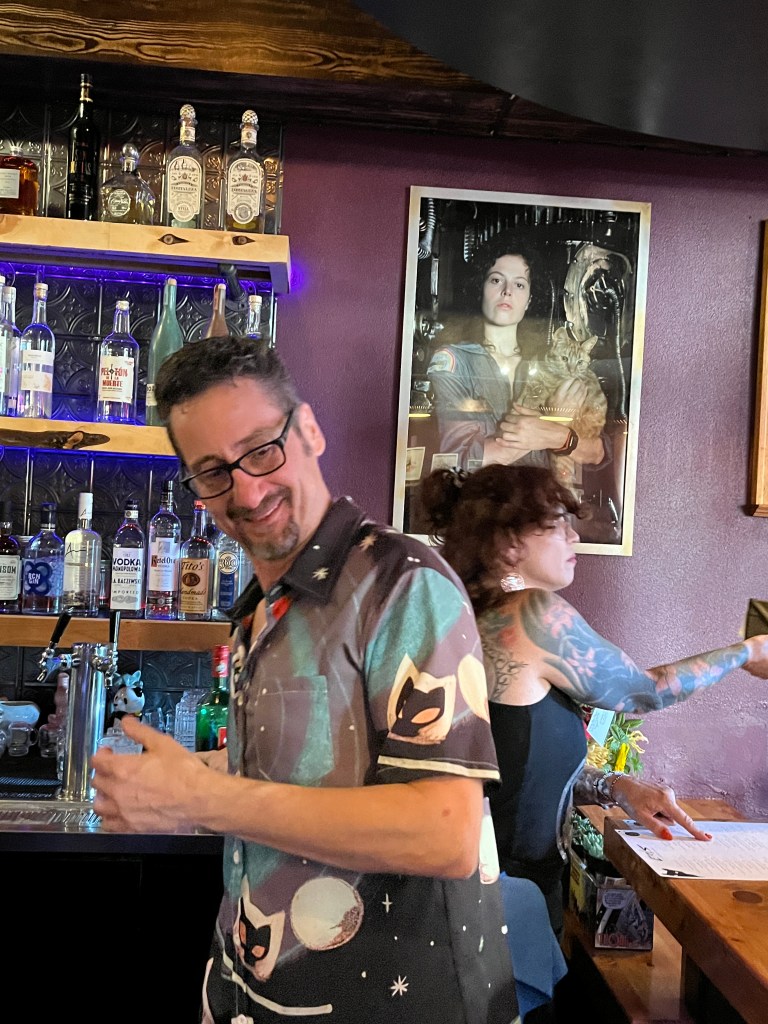 Sigorney Weaver as Ripley (with her cat) keeps look out from over the bar; homages to Sir Terry Pratchett decorate what we will forever call OUR table, and Vigo from Ghostbusters II haunts the bathroom.