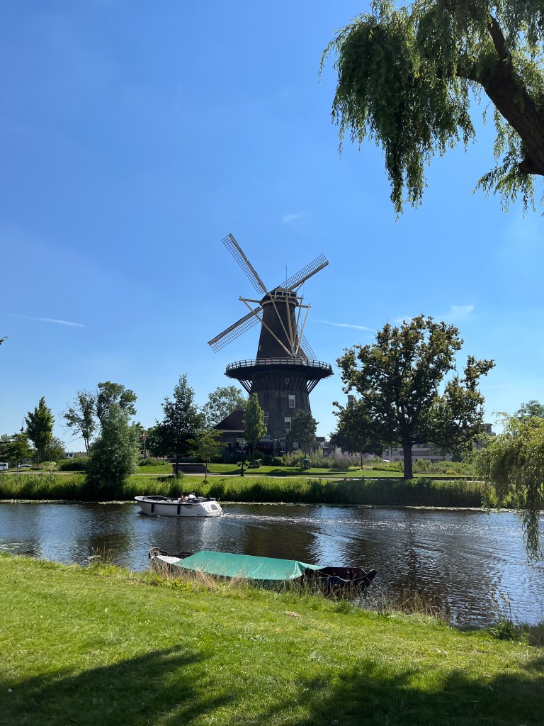 The parts of Leiden we have seen are busy, modern city businesses that work in a very canal laced geography. This giant windmill sits beside a canal on the way from the train station.