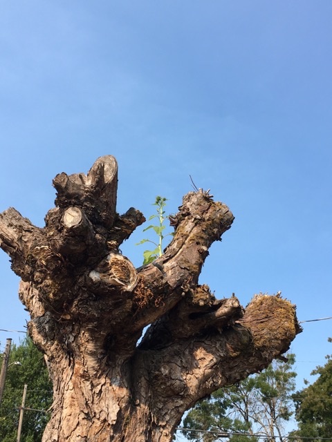 And last but definitely not least, the sunflower that has made this dead chestnut tree its new home. The tree was fatally pruned to a height of about ten feet. I am glad it is having a useful afterlife.