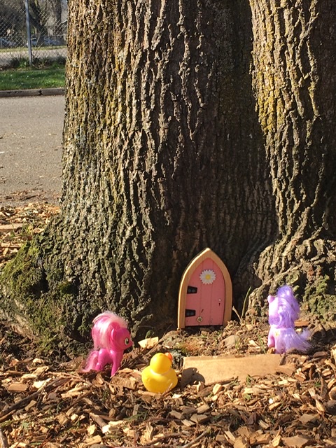 In the parkway by the shop, Cousin Kestrel has installed a new fairy doorway and friends in one of the elm trees. Kestrel is always taking care of our local fairy folk, and their pony and ducky friends.
