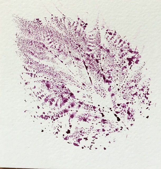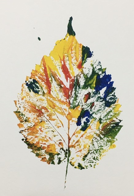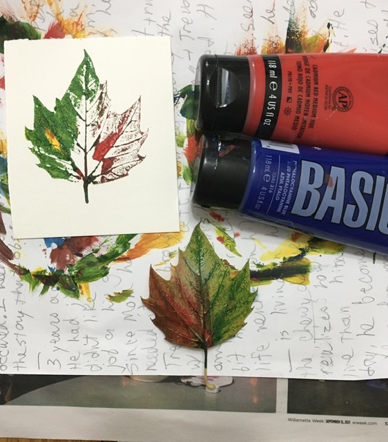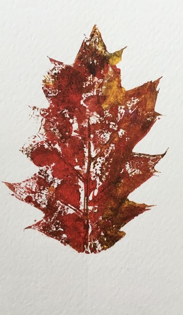 Paint your choice of colors on the back of the leaf, then carefully lay it, wet side UP, on a clean sheet of newspaper. Lay a piece of watercolor paper over it and rub to get lots of paint from the leaf to the paper. Then carefully peel the leaf off and set the paper aside to dry.