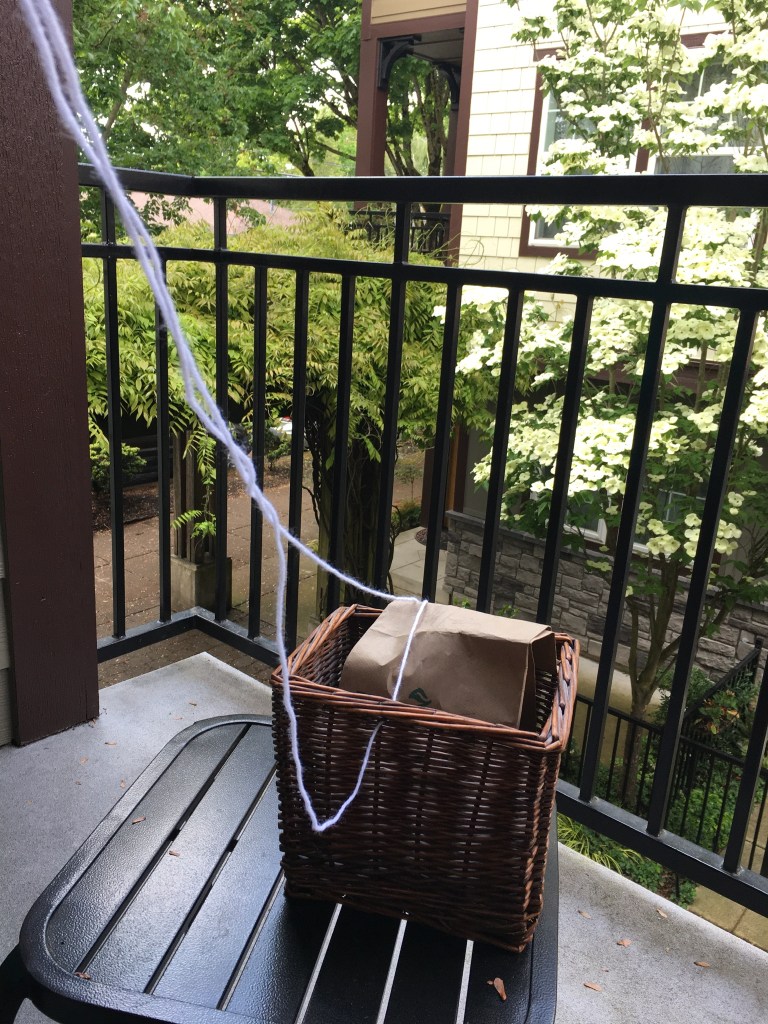 I lowered some of the cookies and one of the pints of ice cream down in a basket-and-yarn rig that was half Rapunzel and half Swiss Family Robinson, and got the job done with just the right amount of whimsy.