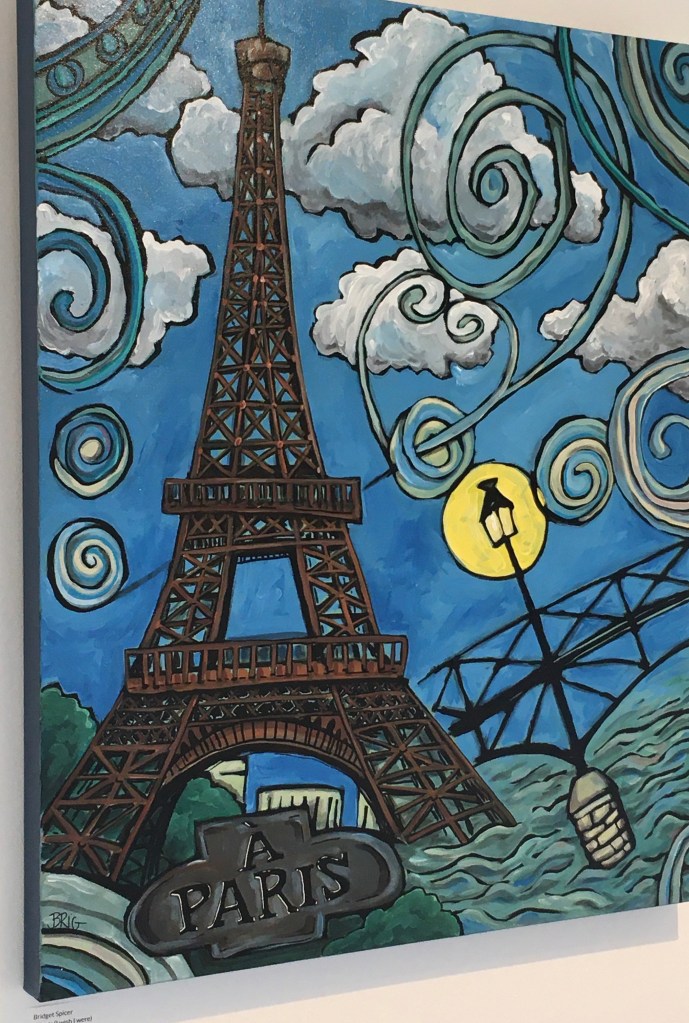 When it was almost time to go, Dawn suggested that Auntie Bridgett put another painting up for the show, “A Paris”. (There is an accent over the a, so it is pronounced ‘ah Par-ee’. It means ‘in Paris’.) There was space in the alcove and folks had been asking about it, she said… might be nice to have it out. Since the painting was just sitting in the back room, it was easy enough to hang. Hooray!