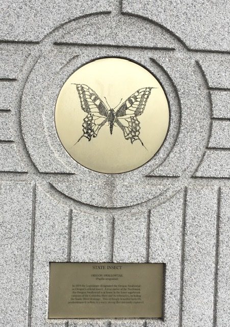 We knew busy Broadway Street was just up a few blocks, so we headed in that direction. On the way, we found these plaques showing the state bird, fish, flower, insect and mammal of the state of Oregon. They were a nice decoration, making the back of a parking garage interesting and educational.