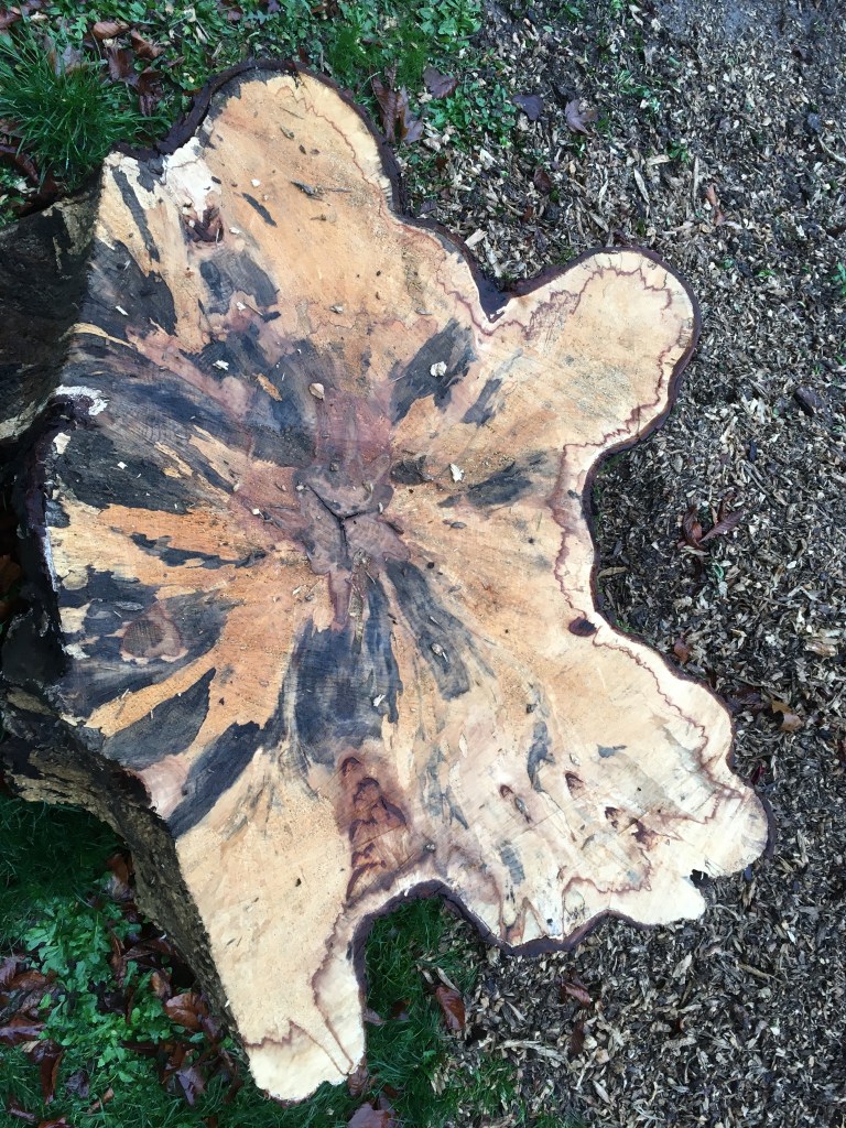 There was more sad beauty as I walked around. One of the magnificent chestnut trees has been taken down, which steals some of the deep shade and history of the place. But its cross section seems to be a view into some sort of cosmic vortex. This tree has seen a lot in its hundred plus years, I imagine.