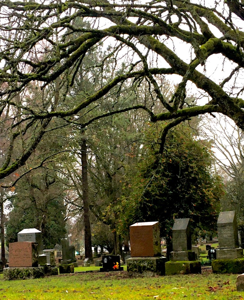 Where do you find fresh, blooming flowers in the middle of winter? Turns out, it’s the cemetery. Lone Fir, to be exact. I hadn’t visited the Dead People for a while, so yesterday I bundled up and headed over.