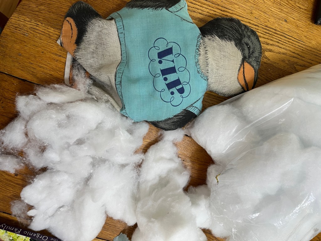 It’s been 40 years or so since VIP TLC has been washed, and I want to bring him with us this summer. So he got unstuffed and put into the wash. While he was getting clean, I fluffed up the old stuffing. When he was dry, I put them back together. Now he is ready for a flight to Denmark!