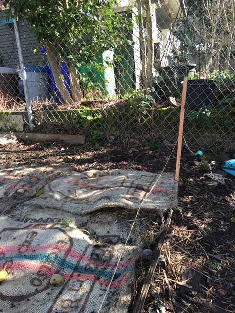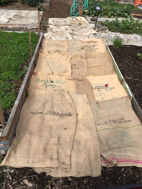 I met a fellow gardener when I went to fetch the old coffee bags we use for covering the paths, and we chatted as we rested. Using Dickon the wagon to carry the heavy burlap, I covered the path with recycled coffee sacks.