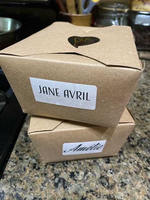 After reading the illustrated menu, I chose the Jane Avril almond cake with raspberries, and Auntie Bridgett got the Amelie, a chocolate and hazelnut delight. We placed these in a second bag and walked home, battling the rain and the gusty winds.