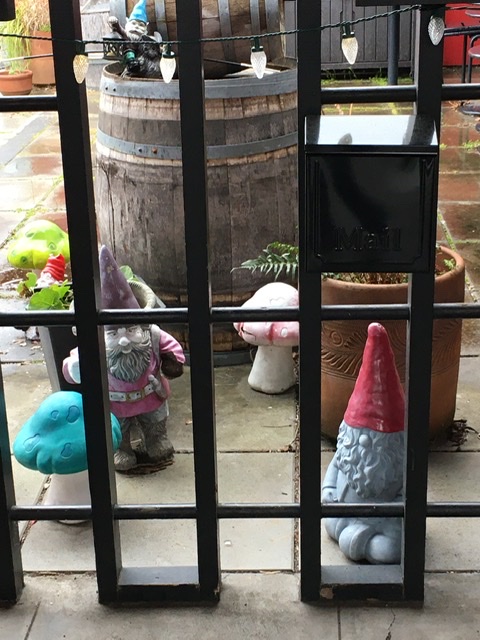 We enjoyed the adventure, being mindful of the guard-gnomes, of course. Inside the little automat doors were RBG masks, a canned survival kit (with waterproof matches, three yards of cord, and other useful things) and canned mussels in vinegar, to name a very few. But we were there for the pastries!