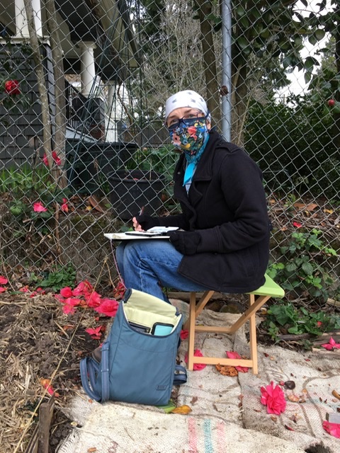 We bundled up against the chilly morning, carrying the seeds, the lavender plant, and nifty home made garden markers along in a bag. We chatted briefly with other gardeners. After so long in isolation we long for companionship, but we were all there on our own missions. The camellia tree had given us more blossoms, and I realized it may be a good idea to trim it back just a wee bit, to give us more space and sunlight. All good relationships need a little space, right?