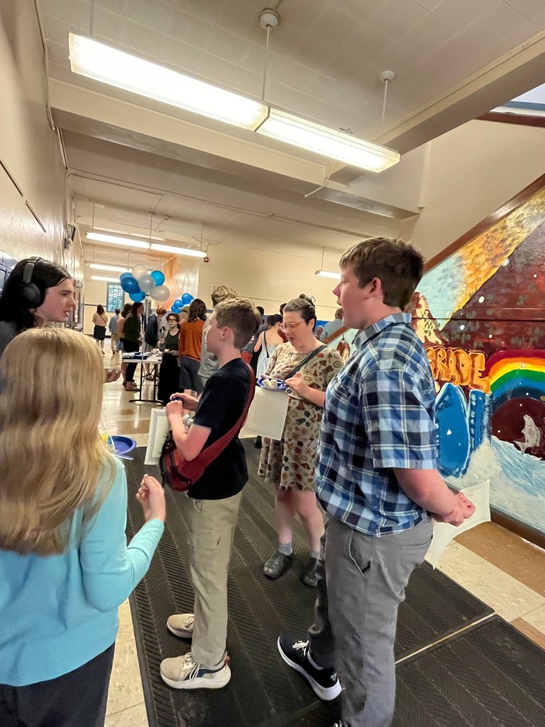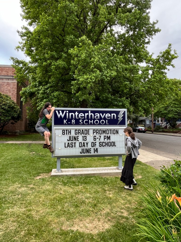 After cake and conversation in the main hallway, there were some unexpected shenanigans outside. Seeing some fellow eighth graders climbing the sign, Jasper wanted to, as well.