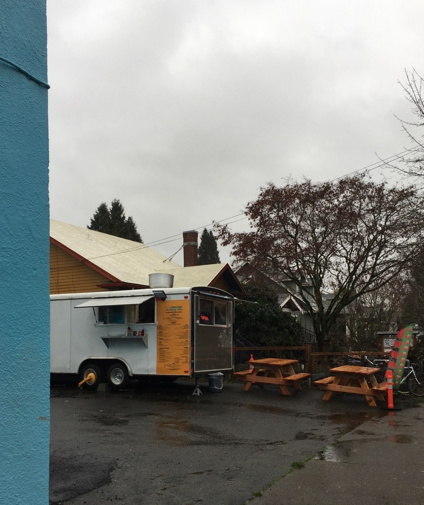 We got hungry and Kes and I braved the rain out to the FIRST food cart, La Sabrosita, in Katie’s parking lot. Basilio and his daughter make good burritos, tacos, and carnitas. We ate back in the house, but on sunny days in summer, the picnic tables are going to be a happy place!