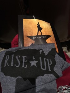 We had time to buy some souvenirs. I got a tee shirt that says RISE UP that I can wear to school and tell my students about the story of Alexander Hamilton, an immigrant who helped write the rules of our country. Your mommy got a show book so she could tell you the story of the show we saw, with pictures of the actors.