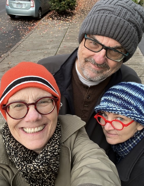 But once things were settled, and before company arrived, I needed to take a walk out in the fresh, rainy air of the neighborhood. My pretty new scarf from Grandpa Nelson goes perfectly with my sweater and hat from Donna! Whoever thought I would be wearing a coordinating, purple outfit?