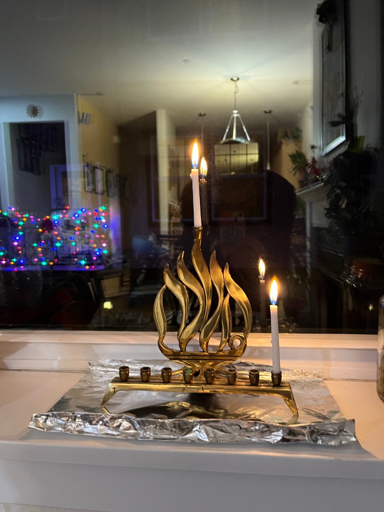 After dinner we lit the candles for the first day of Hanukkah, and Katie set them up with some tin foil. “Putting the candles in the window is a mitzvah,” she explained. “Dripping wax on the sill isn’t.” Auntie Bridgett agreed. I like this picture of the menorah and reflections, through the window to John and Stacy’s balcony lights.