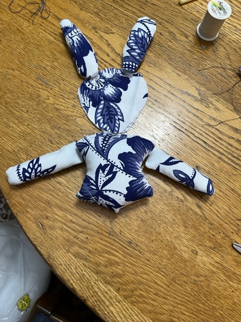 A few weeks ago, when Harold came home from San Diego, Kes said that we should make a new stufftie to keep him company. We dug through the big fabric box and she chose the remnants of the same fabric I had used years ago to make placemats for your mommy! It was very pretty, but there wasn’t a lot left.