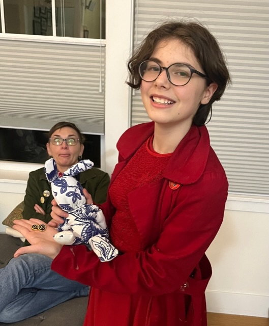 By sewing and stuffing each section of the stufftie separately and hand-sewing the sections together, we created a delightfully floppy friend. Kes said the fabric pattern looked like a teacup, so we named him Chashka, which is the Russian word for teacup. Kes chose some weird, wonderful spiral buttons for his eyes, which she will attach later on.