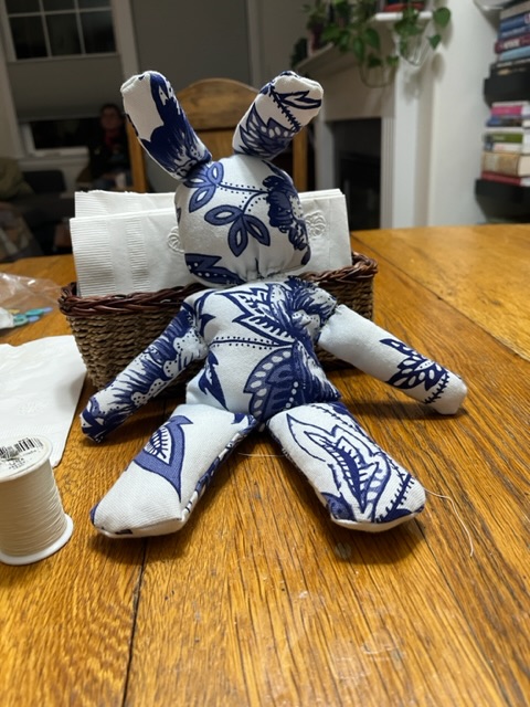 Once we started hand-sewing the parts together, it became clear that our new friend’s head wasn’t big enough! There wasn’t enough fabric…. Or was there? Some clever piecing allowed us to make a head of proper proportion, and was barely noticeable on the back of his head.