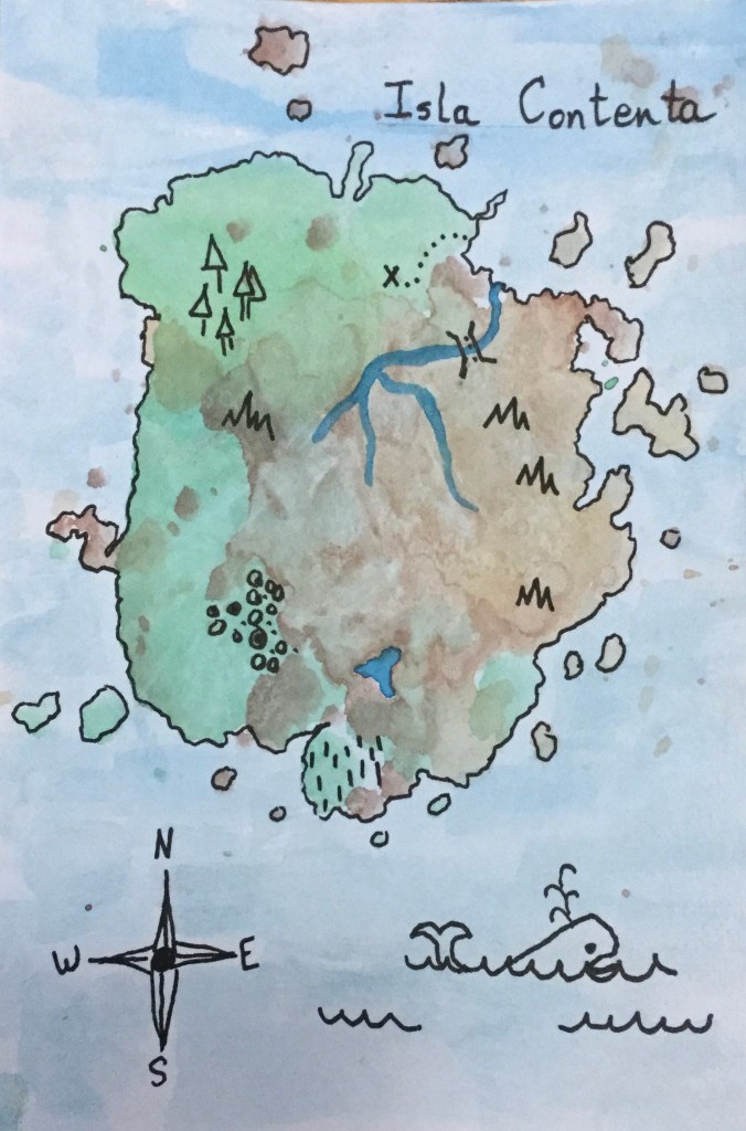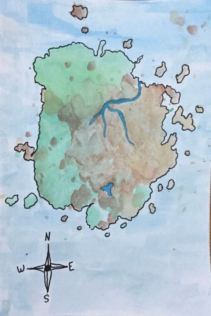 Once you are happy with how your island looks, you can make it more map-like by tracing the shoreline with a pen and putting in waves, sea monsters, and other details like mountains, buildings, or bridges.