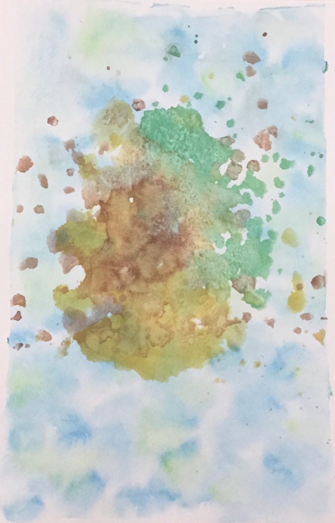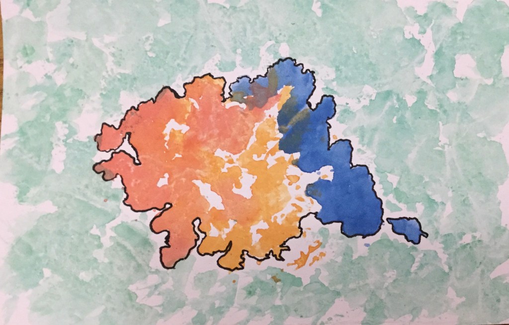 You will have an irregularly shaped blob with really interesting edges and shadings. This will dry quickly. When it does, repeat with a different color, extending your ‘island’ and partially overlapping your first layer.