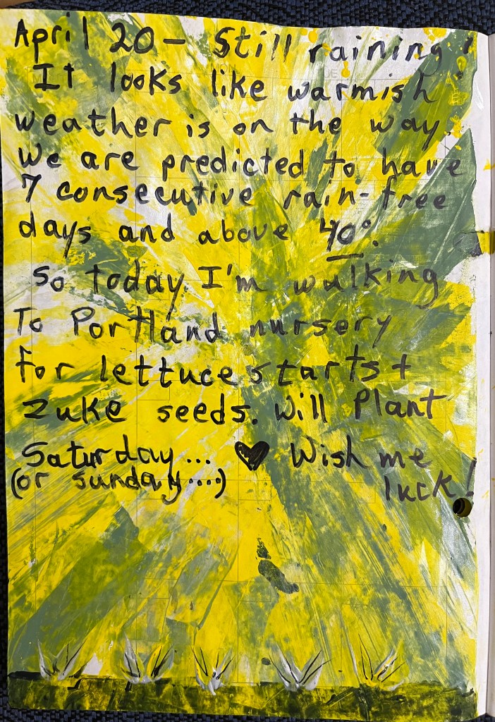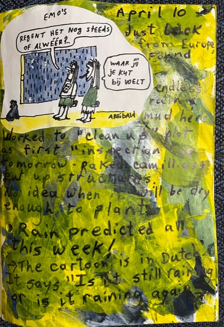 The problem (is it a problem? Or an opportunity?) is that my Journal is filling up fast. I will need another in a week or so. Do I get the same size? This one is 8.5 by 11 inches, and I like having the big pages to play with. Since I don’t carry it with me, it’s not really cumbersome.
