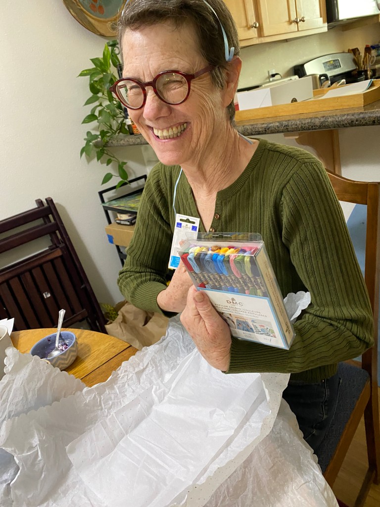 After breakfast, I opened my presents. Auntie Bridgett and Grandpa gave me books on Sister Corita Kent, an artist and nun whose “Ten Rules” have inspired me to keep doing art. Donna, Auntie Bridgett’s mom, send me a big package of embroidery floss to replace all the floss I’ve used up in the crazy quilt.