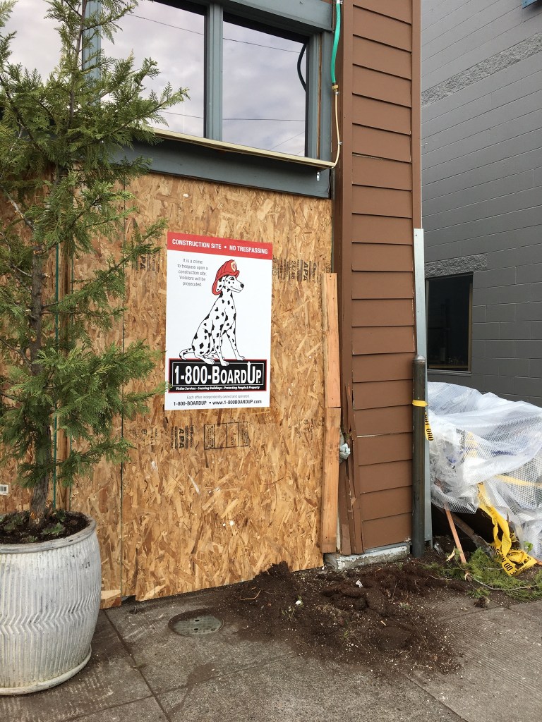 Looking past that, we saw that the wall of the doughnut shop had been boarded up. More bad news.