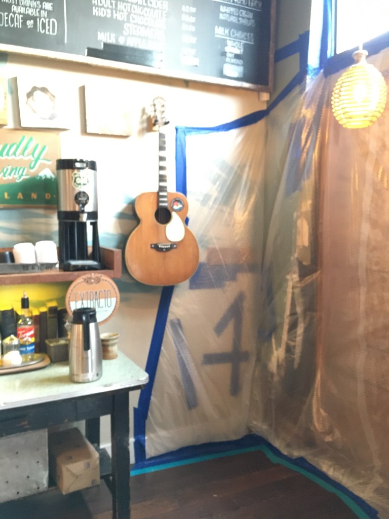 It seems that during the night, a drunk driver had veered off the street and into the shop, breaking a window but missing the door, the supporting pillar, the equipment, and even the guitar hung on the wall. It could have been a disaster, but it was mostly an inconvenience to the owners.