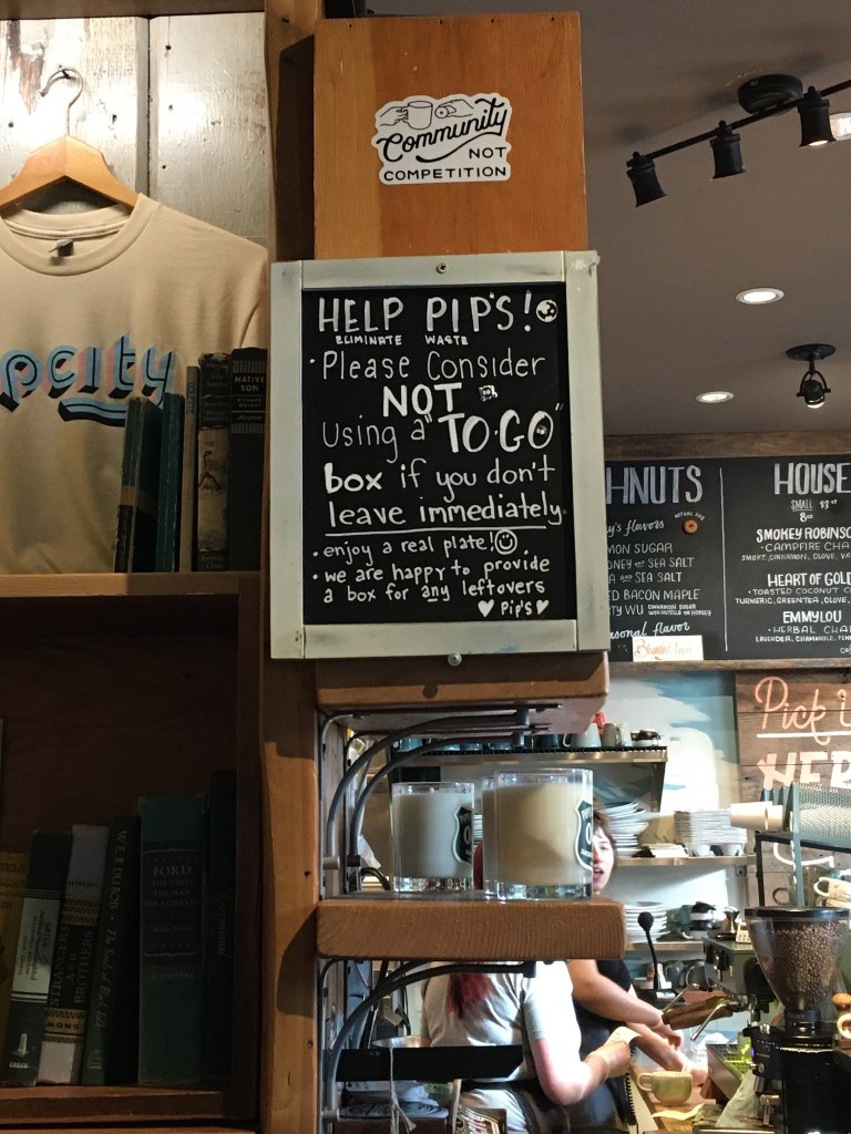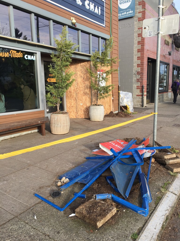 When we got to Pip’s Doughnuts and House made Chai, the first thing we noticed was that the bus stop in front of the shop had been destroyed. The metal bench and sign posts were literally laying in a heap on the curb. That looked like bad news.