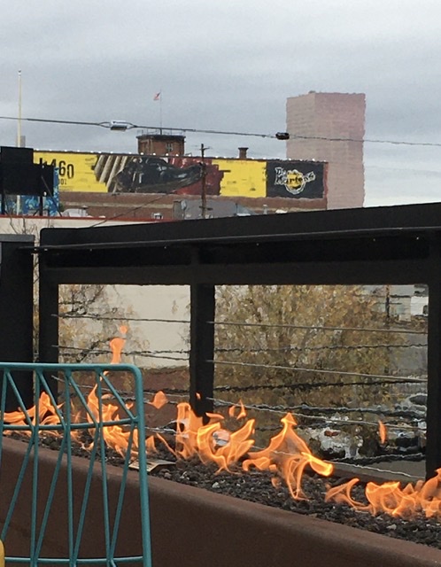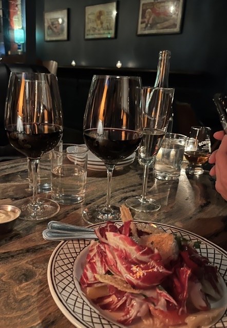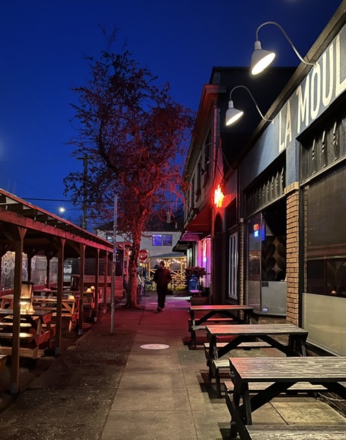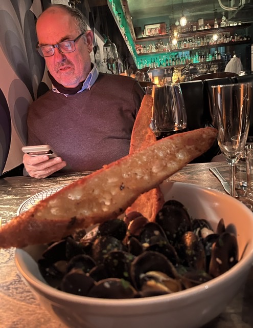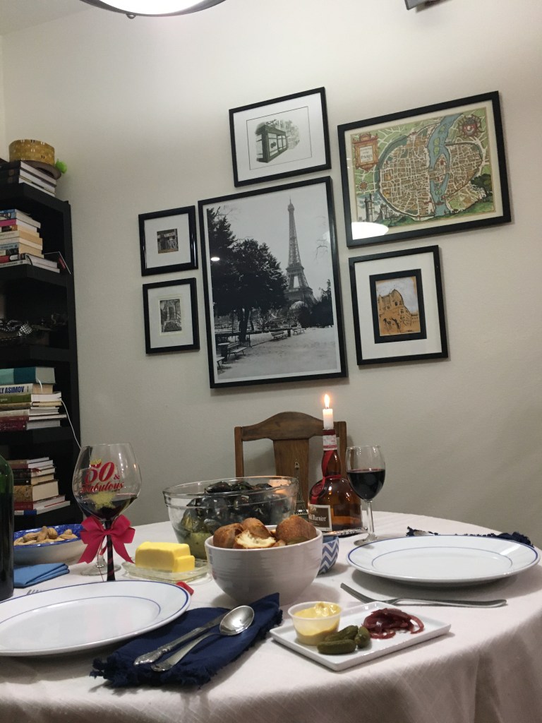 When We Three stepped out to catch our Lyft ride to La Moule for our anniversary dinner, it was near freezing! The Christmas lights on all our neighbors’ balconies sure looked pretty.